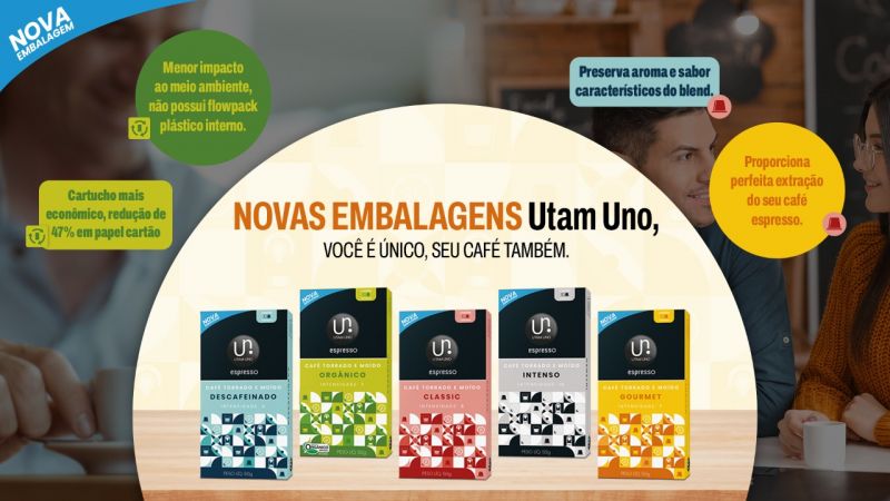 A escolha da indústria de café para o visual desta linha de produtos desenvolveu cores atrativas e um design contemporâneo. A proposta é equilibrar o conceito da marca à busca da nova geração de coffee lovers, cada vez mais diversificada e exigente. “O objetivo com a troca das embalagens é atualizar o conceito da linha Utam Uno de forma mais atraente e sustentável, uma vez que a nova embalagem economiza 47% de papel cartão, além de eliminar a necessidade do flowpack interno”, complementa Fabiana.